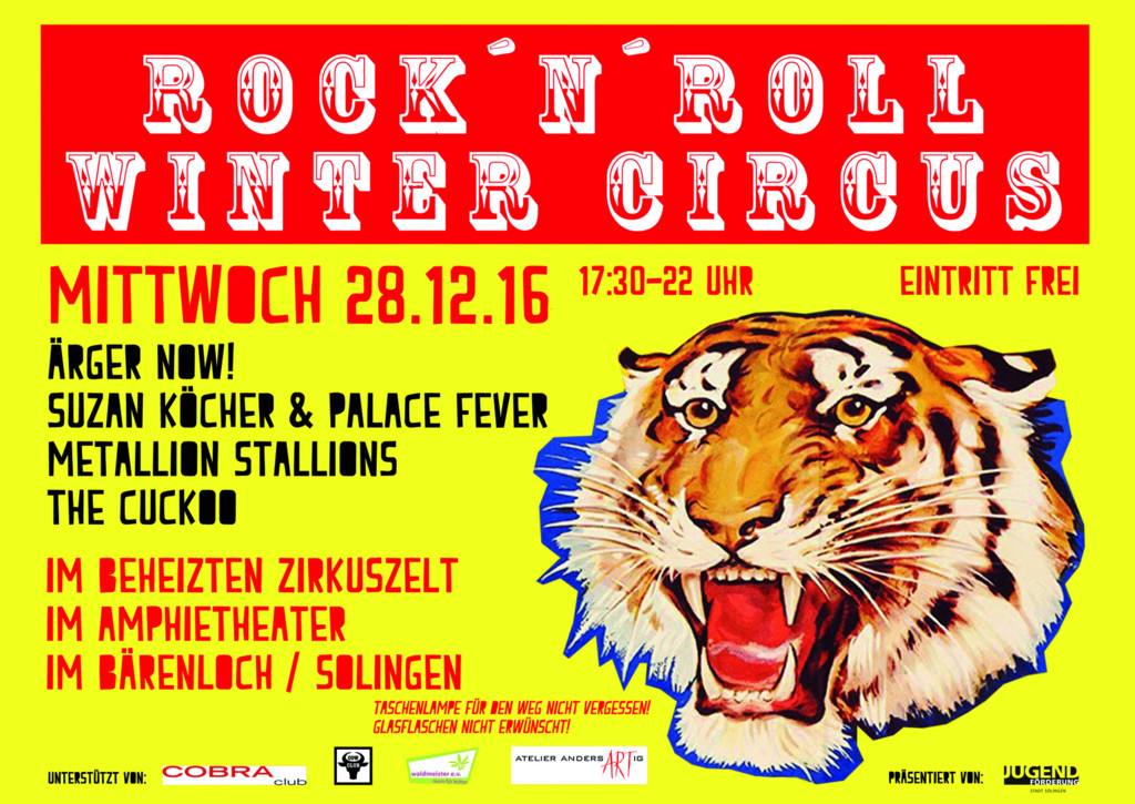 Hier noch ein heißer Tipp für alle Konzertgänger unter euch. Die Jugendförderung Solingen veranstaltet am 28.12.2016 im Bärenloch/Solingen den Rock n Roll Wintercircus wobei 4 lokale Acts am Start sind, die jedoch auch schon ein größeres Publikum begeistern konnten. Das Beste ist aber: Der Eintritt ist kostenlos und auch die Getränkepreise sollen nicht sonderlich hoch ausfallen. Das Ganze findet im Freilichttheater im Bärenloch statt.